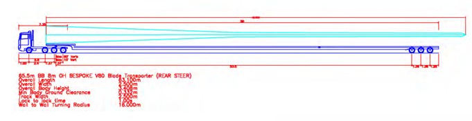 According to the swept path drawings the vehicle carrying the turbine blade will be a total of 63m long. THIS IS CLEARLY WRONG! With a rotor diameter of 150m the blades must be almost 75m, say 74m long then we have to add the cab and clearance makes the total length around 80m!