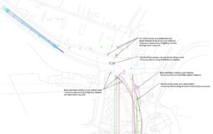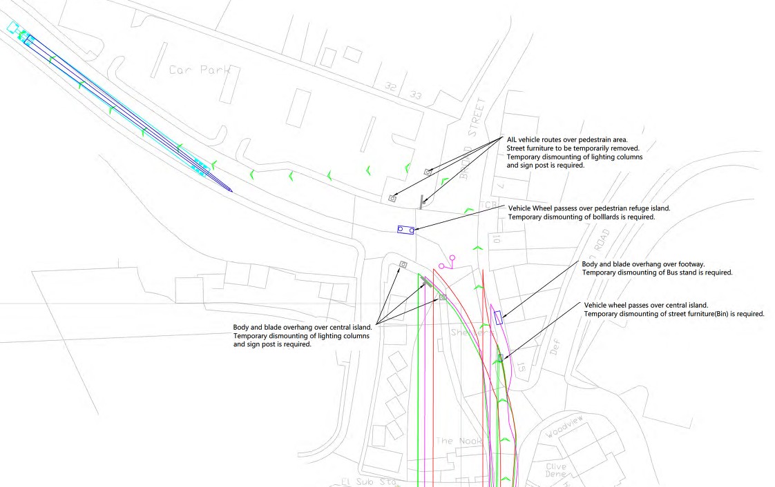 The AILs (Abnormal Indivisible Loads) and all the construction HGVs will pass north form Pontypool and turn left in Abersychan where the vehicle will use most of the width of the carpark to allow it to turn up towards Big Arch. Lamp posts, the bus stand, signposts and bollards will be removed.